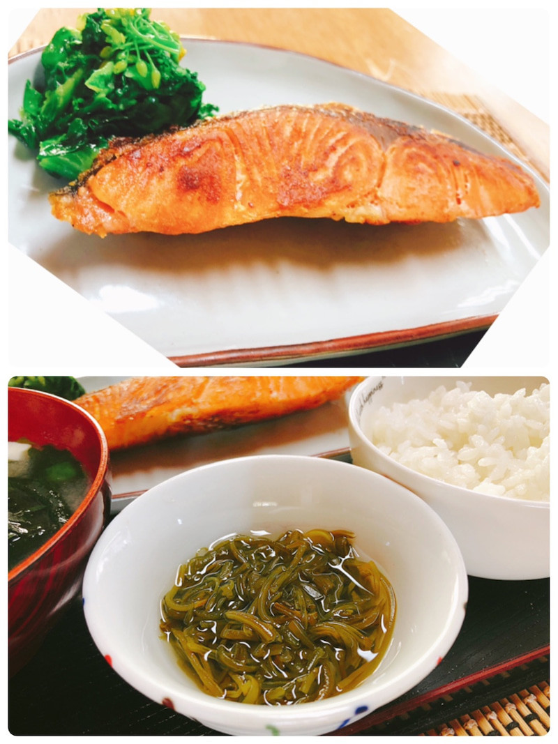 美味しい鮭を頂いたので焼き鮭にしました。茹でた菜花も一緒に。(ごま油、麺つゆ少々で味付けしました)